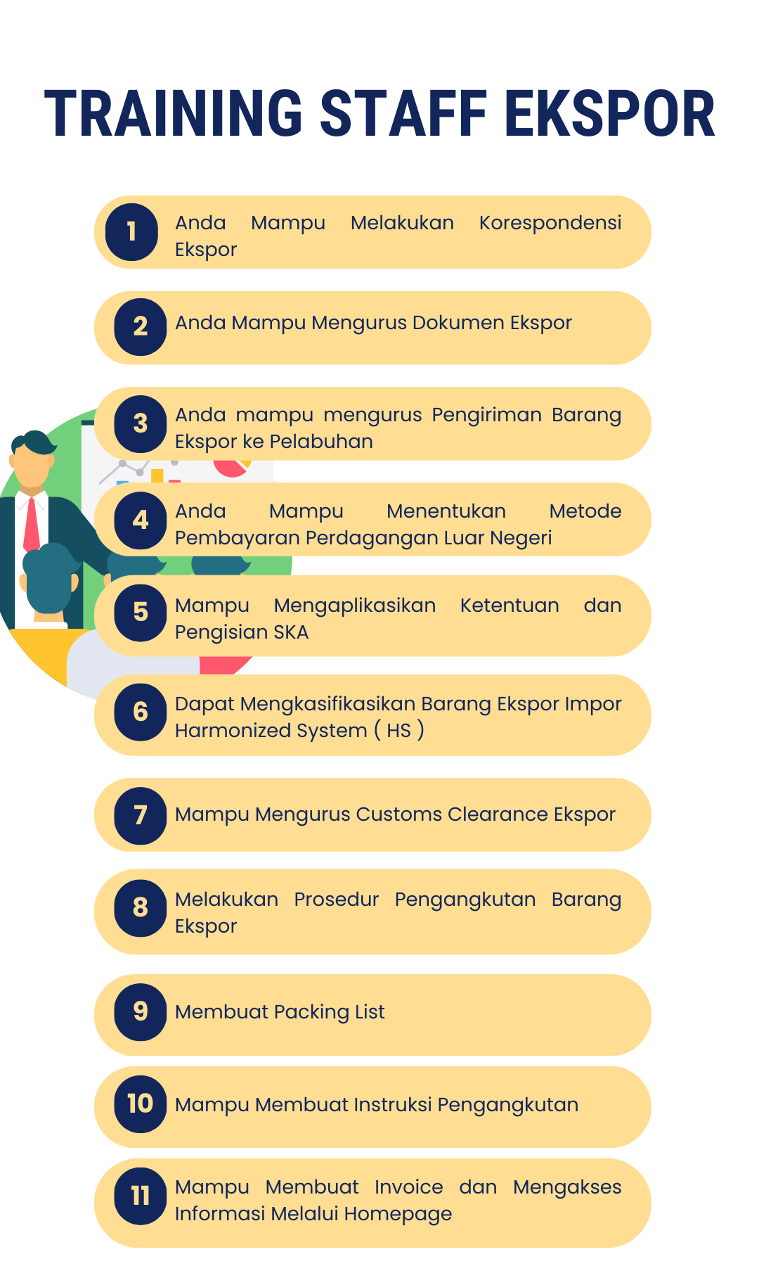 Ingin membawa bisnis Anda menuju puncak kesuksesan internasional? Anda telah tiba di tempat yang tepat! Training Staff Ekspor adalah platform unggulan untuk memberdayakan tim Anda dalam dunia ekspor. Bersama kami, Anda akan menemukan kunci sukses dalam mengembangkan bisnis global dan meraih peluang tak terbatas di pasar internasional